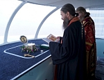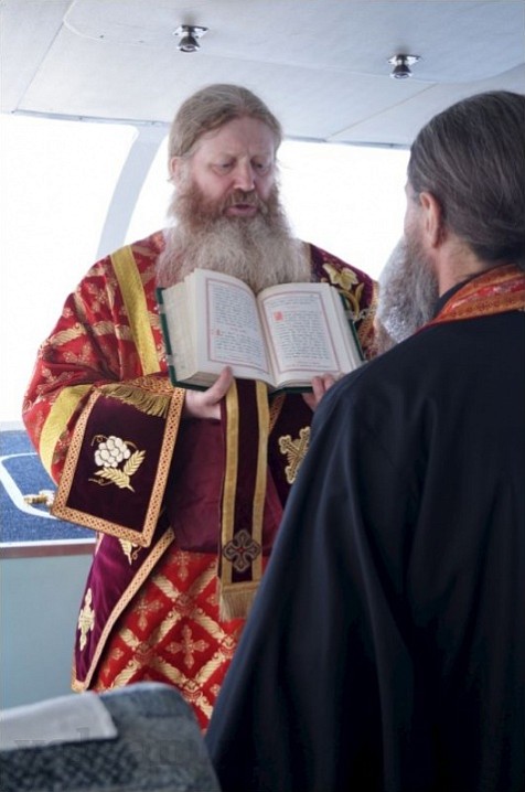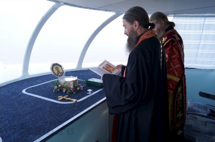 Капитан корабля освятил у Святого ковчега икону святителя Николая чудотворца, и рассказал интересную историю появления этой корабельной иконы. В один из своих первых рейсов теплохода "Игумен Назарий" в 2008 году, капитан корабля Иван Камов получил её в дар от юноши-паломника из Сан-Франциско (США), и с тех пор команда корабля не расстается с этой иконой, которая занимает центральное место в капитанской рубке.
