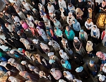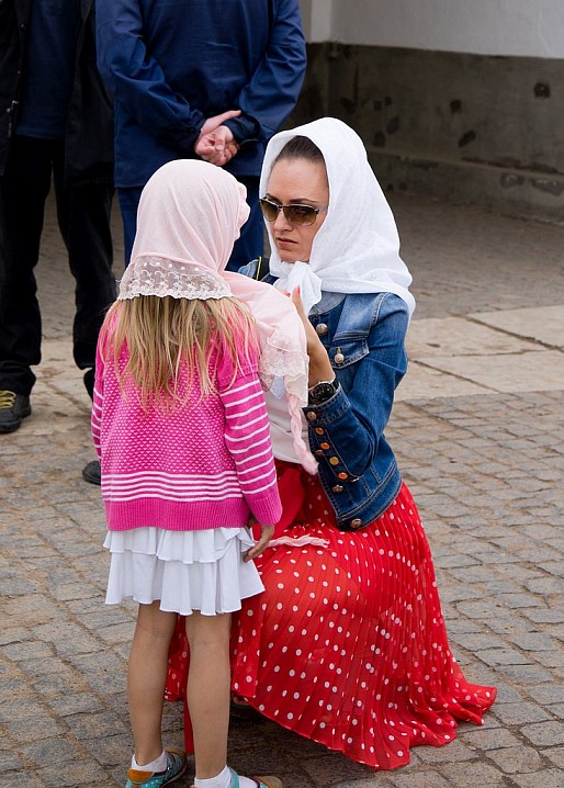 Крестное знамение должно совершаться благоговейно. Крестясь, человек изображает на себе символ Христовых страданий за грехи человеческие, поэтому делать это следует с величайшим благоговением и вниманием. Заходя в храм, мужчины снимают головной убор. Все чаще глаза отмечают темные одежды насельников обители.