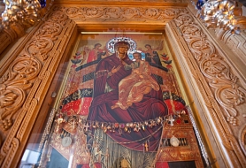 Образ Царицы Небесной "Пантанасса" помещен в обители в храме преподобных Сергия и Германа, Валаамских чудотворцев на левой колонне, недалеко от раки честных мощей основателей "Северного Афона".