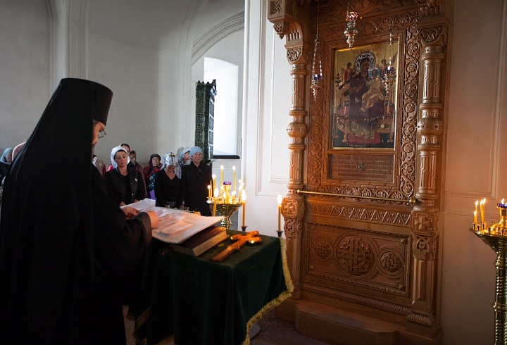 Тропарь, глас 4: Образом радостотворным честныя Всецарицы, желанием теплым взыскающих благодати Твоея спаси, Владычице; избави от обстояний к Тебе прибегающих; от всякия напасти огради стадо твое, к заступлению Твоему взывающе присно.