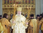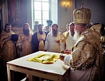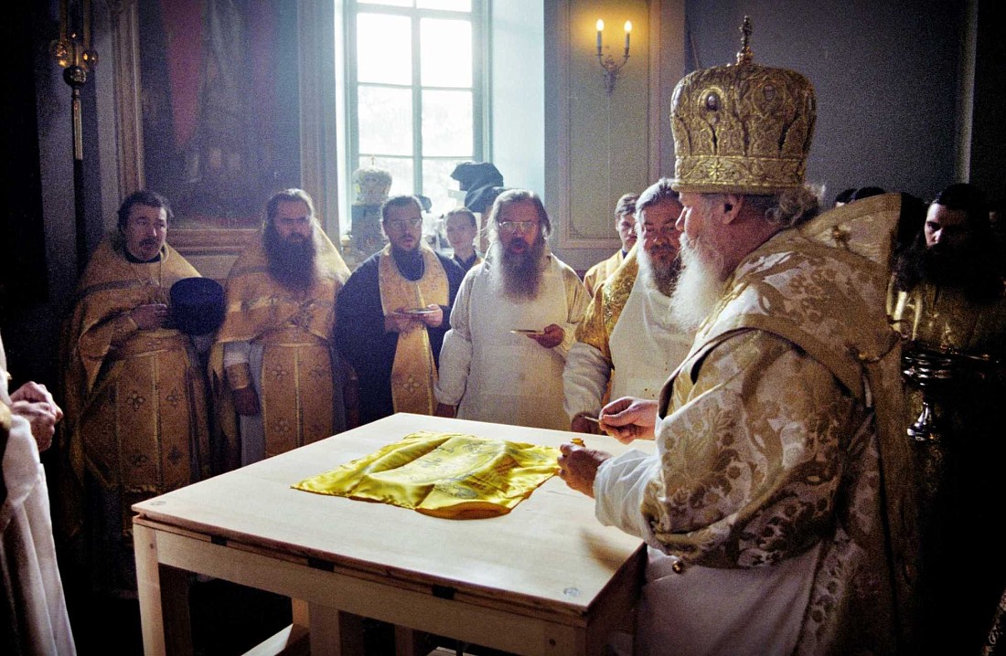 Затем Его Святейшество проследовал в Преображенский собор, нижний храм которого освящен во имя преподобных Сергия и Германа Валаамских. Здесь Первосвятитель совершил молебен основателям Валаамского монастыря и обратился к насельникам обители и паломникам с приветственным словом. Его Святейшество также поблагодарил членов Попечительского совета за заботу о возрождении Валаамского монастыря. "Верю, что всем миром мы возродим эту духовную и архитектурную жемчужину Северной Руси", - подчеркнул Святейший Патриарх.