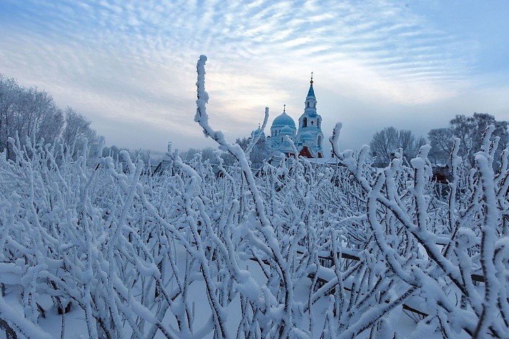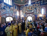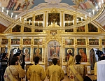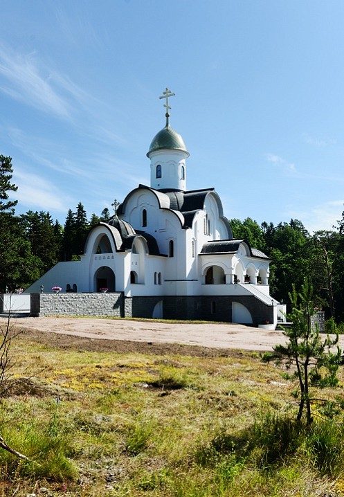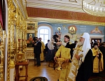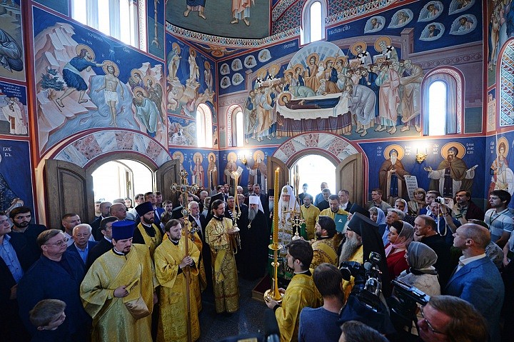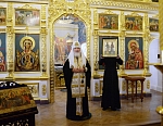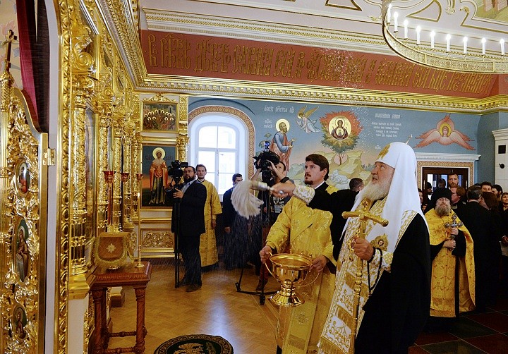 В тот же день Святейший Патриарх совершил чин малого освящения храма Успения Божией Матери Валаамского монастыря, находящегося на территории Внутреннего каре и примыкающего к праздничной трапезной. Отреставрированная Успенская церковь - один из первых храмов, построенных игуменом Назарием в XVIII веке.