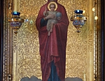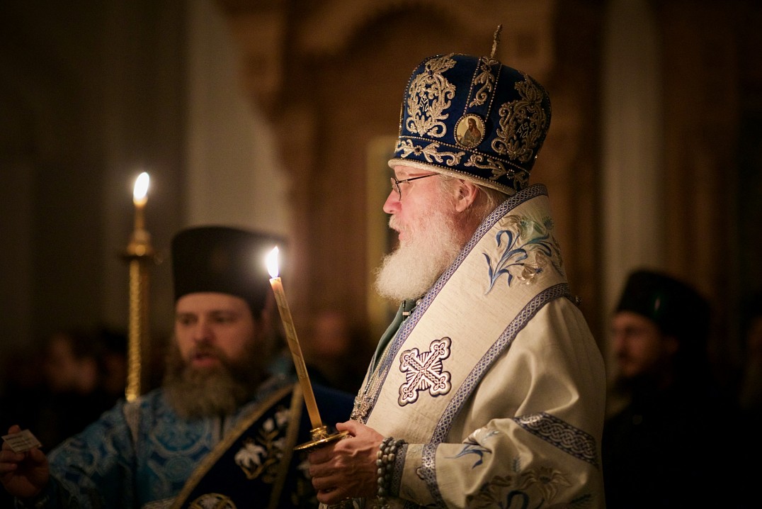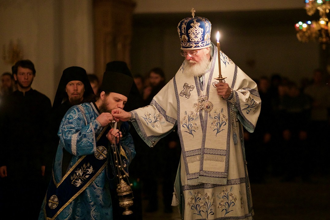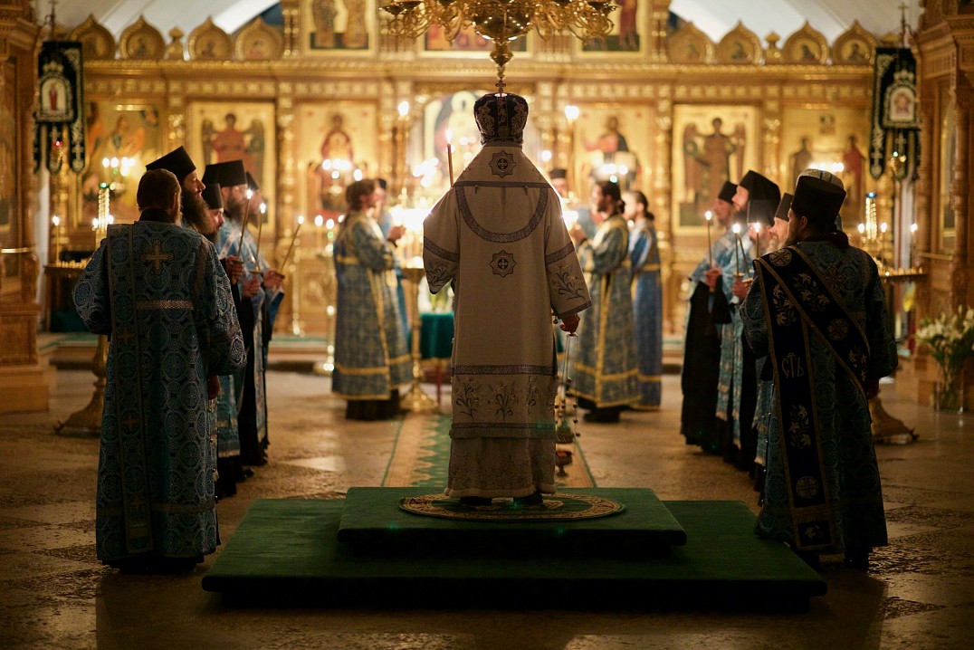 И вот в четвертом часу ночи, видит святой Андрей Пресвятую Деву Богородицу, идущую по воздуху от Царских Врат. Ее поддерживают св. Иоанн Предтеча и св. апостол Иоанн Богослов. Многие святые в белых одеждах сопровождают Ее. Когда Она приблизилась к амвону, прп. Андрей подошел к Епифанию и спросил: