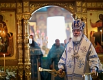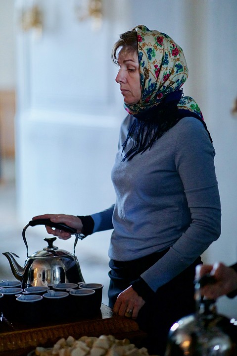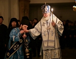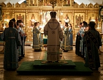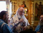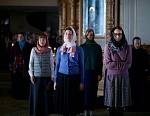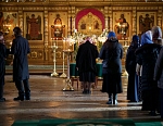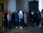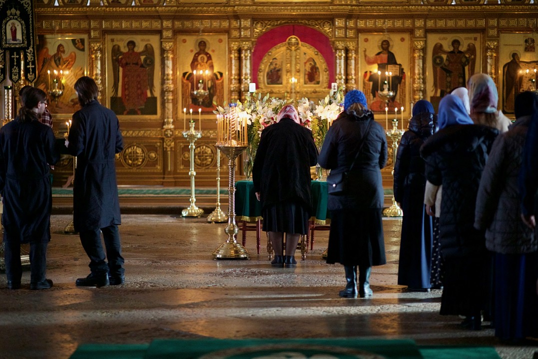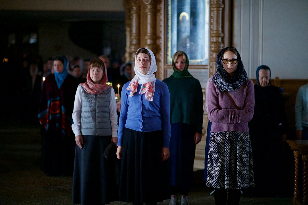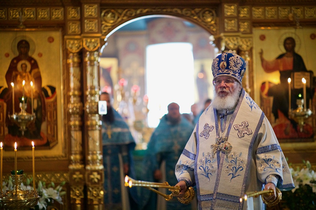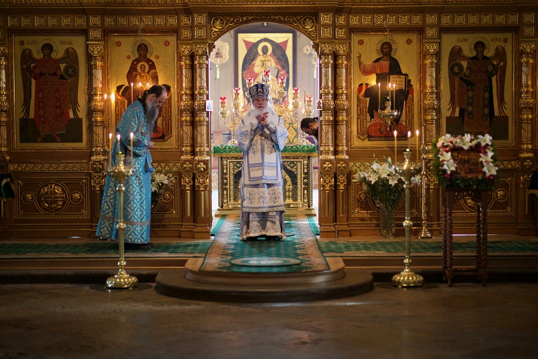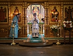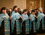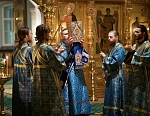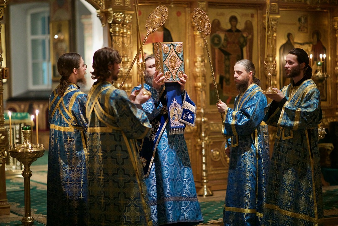 Долгий час молилась Она, обливая слезами Свое Боговидное лицо. Окончив молитву здесь, Она подошла к престолу и стала молить за предстоящий в храме народ. По окончании же молитвы сняла Богородица с Пречистой главы своей сияющий покров и, держа его с великой торжественностью, распростерла над всем стоящим народом.